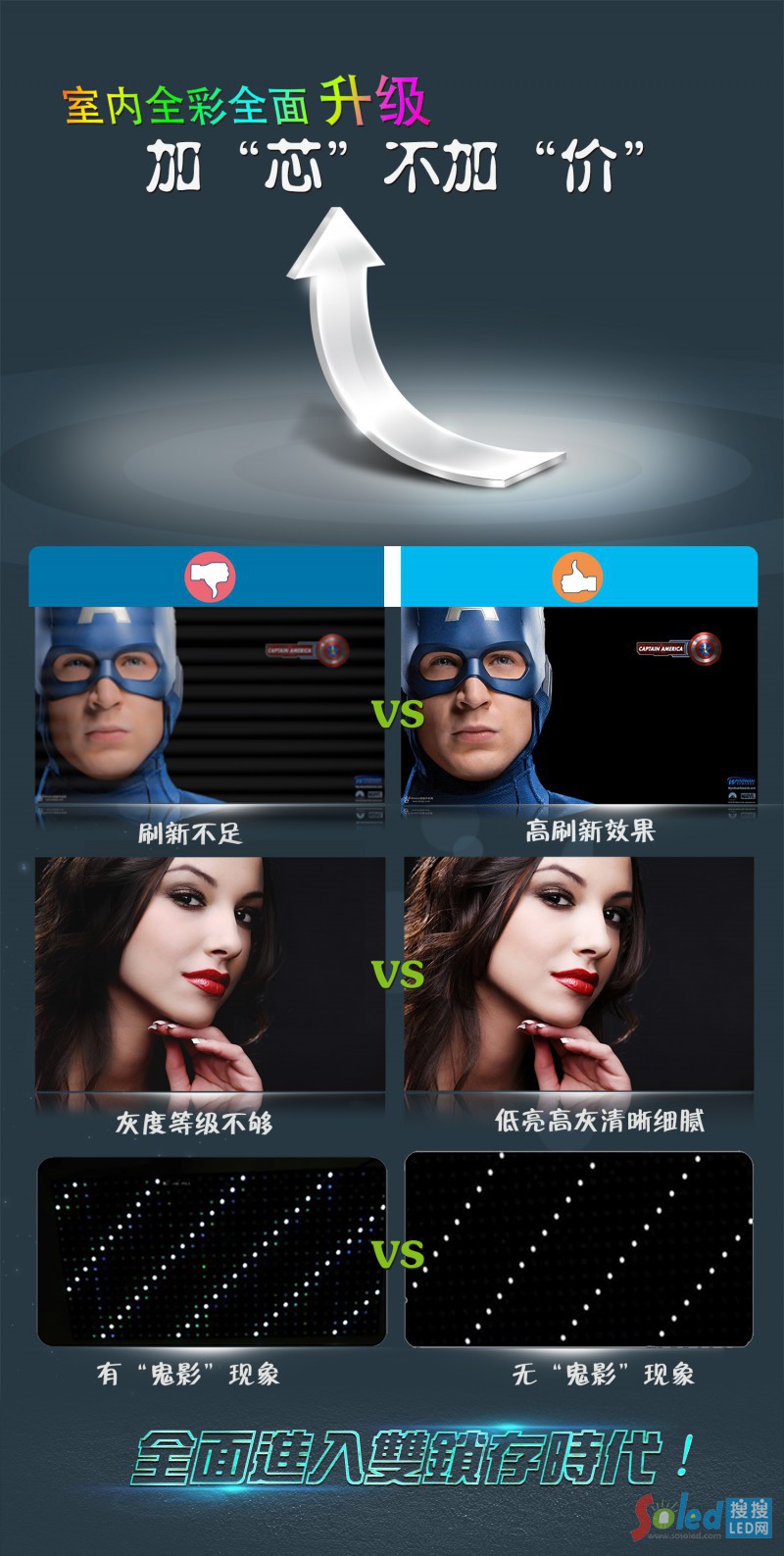 戶外S高端系列之所以能夠取得如此巨大的成功,采用雙鎖存高性能驅(qū)動(dòng)芯片無(wú)疑是其中非常重要的一環(huán),它讓?xiě)敉釹高端系列最終完成華麗蛻變,廣受好評(píng)。今天大好消息傳來(lái),強(qiáng)力巨彩室內(nèi)全彩產(chǎn)品全面更“芯”換代——配備雙鎖存高性能驅(qū)動(dòng)芯片,這意味著強(qiáng)力巨彩的室內(nèi)外全彩產(chǎn)品將全面進(jìn)入雙鎖存時(shí)代。更“芯”換代后的室內(nèi)全彩產(chǎn)品刷新率將實(shí)現(xiàn)翻倍,播放效果如同行云流水;更為有效的消除鬼影功能,將會(huì)讓LED顯示屏的顯示效果倍加清晰細(xì)膩。