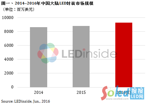 LEDinside分析師余彬表示,2016年照明廠商回補庫存的需求出籠,使得LED芯片廠商稼動率提升,市場出現(xiàn)回暖跡象。上游LED芯片價格止跌,僅少數(shù)廠商對LED芯片價格漲價,因而短期內(nèi)LED封裝價格將維持穩(wěn)定。然由于LED行業(yè)進入成熟期,且因技術(shù)提升,背光市場等部分應(yīng)用領(lǐng)域市場規(guī)模已開始萎縮。LEDinside預估2016年中國大陸LED封裝市場規(guī)模為93億美元,同比增長5%。