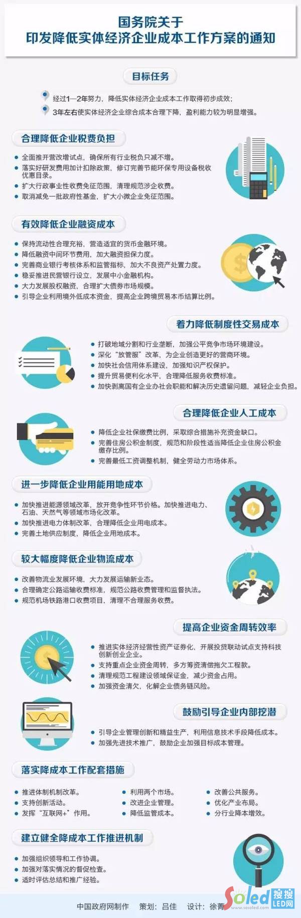 《方案》明確:降成本工作要努力使企業(yè)稅費(fèi)負(fù)擔(dān)、融資成本、制度性交易成本、能源成本、物流成本等得到合理和有效降低,人工成本上漲得到合理控制;3年左右使實(shí)體經(jīng)濟(jì)企業(yè)綜合成本合理下降,盈利能力較為明顯增強(qiáng),產(chǎn)業(yè)競(jìng)爭(zhēng)力進(jìn)一步提升。