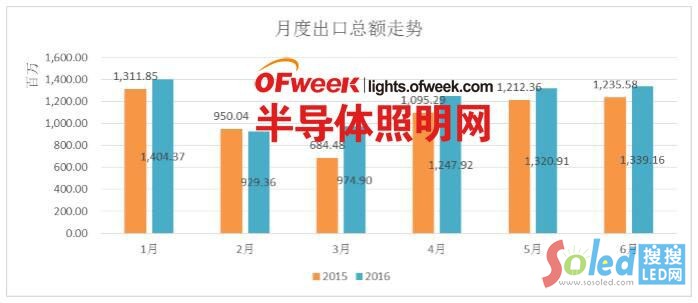 第三、LED市場(chǎng)需求在增長(zhǎng)。從2015年(1-6月)和2016年(1-6月)的LED產(chǎn)品出口數(shù)據(jù)來(lái)看,2016年上半年相比2015年同期LED產(chǎn)品出口量在增加,且在逐步提升。