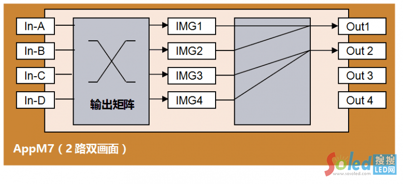 LVP7000 輸出分辨率設(shè)置為1920*1080_60HZ。輸出卡設(shè)置為“AppM7(2路雙畫(huà)面)”此模式,輸出板DVI Out1,Out2分別輸出兩個(gè)畫(huà)面疊加合成后的圖像,Out1=IMG1+IMG2, Out2=IMG3+IMG4,每個(gè)畫(huà)面的大小位置和疊加次序可任意調(diào)整。