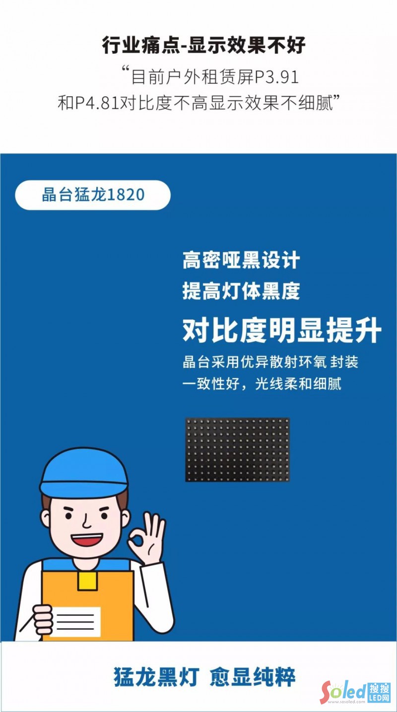 隨著顯示屏細(xì)分化市場(chǎng)日趨成熟,行業(yè)總體向更小的像素間距發(fā)展,其中戶外租賃市場(chǎng)發(fā)展迅猛,在歌舞晚會(huì)、展覽展示、高端會(huì)議等場(chǎng)合都能見到它的身影,但在產(chǎn)品使用過(guò)程中,卻出現(xiàn)了一些戶外顯示“痛點(diǎn)”。晶臺(tái)總結(jié)研發(fā)經(jīng)驗(yàn),把準(zhǔn)封裝發(fā)展脈搏,繼大熱產(chǎn)品猛龍2525后推出猛龍1820,一經(jīng)亮相,就贏得客戶認(rèn)可。1820究竟有何種魅力?我們一探究竟。