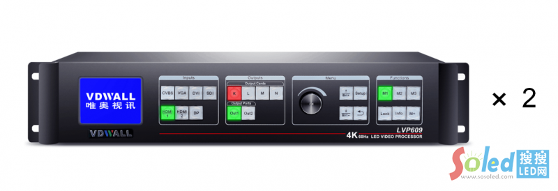 將5376*1792按照實際箱體分布拆分為左,右兩個部分,分辨率都不超過3840*2160范圍,每個部分使用一臺LVP609進行控制,信號源(電腦)給出兩路4K2K@60Hz信號分別給兩臺處理器,通過處理器截取對應大小,讓LED屏點對點顯示達到最佳效果;