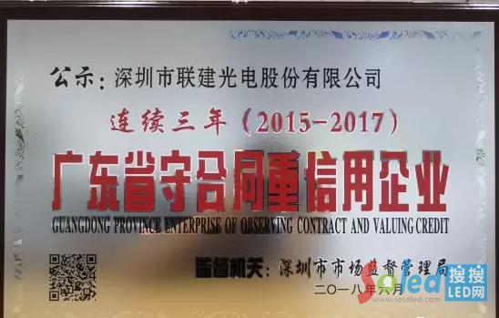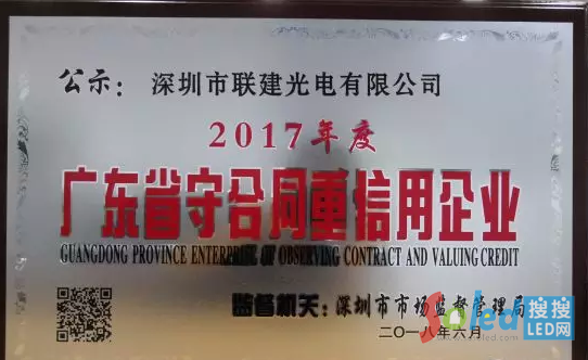 實至名歸|聯(lián)建光電再獲2017年度“廣東省守合同重信用企業(yè)”稱號