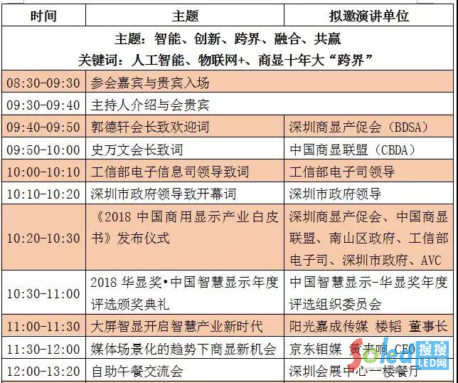 議程顯示,CBDS 2018受到工信部電子信息司和深圳市政府的大力支持,期間會發(fā)布智慧商顯行業(yè)最具權(quán)威性的專業(yè)指導(dǎo)用書——《2018中國商用顯示產(chǎn)業(yè)白皮書》,同時進(jìn)行具有業(yè)界“諾貝爾獎”美譽(yù)之稱的頒獎盛典——2018華顯獎•中國智慧顯示年度評選頒獎典禮。緊接著將有商顯業(yè)界著名企業(yè)視源、?低暋⑿◆~易連,專業(yè)的大數(shù)據(jù)綜合分析服務(wù)商奧維云網(wǎng)(AVC)、傳媒界知名品牌陽光嘉成傳媒、京東鉬媒以及創(chuàng)大資本、無錫變格等其他相關(guān)領(lǐng)域的數(shù)十位貴賓蒞臨現(xiàn)場,分別做與商顯相關(guān),并在各自領(lǐng)域十分熟知與擅長的精彩主題演講。另有鴻合、利亞德、皓麗、華星光電、TCL、信頤、DSMA、深圳旅游飯店業(yè)協(xié)、BOE、云天勵飛等十家企業(yè)大咖組成高峰對話強(qiáng)大嘉賓陣容,展開一場精彩絕倫的觀點交鋒和思想碰撞,相信屆時將為在座聽眾帶來一場完美的參會體驗。