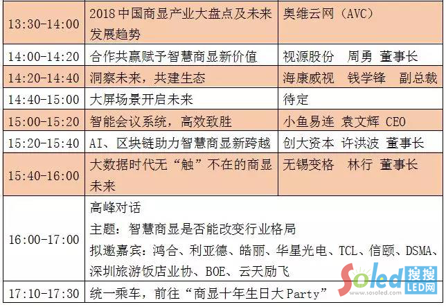 作為“商顯十年大慶”的CBDS 2018,肩負(fù)著歷屆領(lǐng)袖峰會的輝煌成就總結(jié)回顧與未來領(lǐng)袖峰會商顯趨勢的預(yù)測使命,「2018 中國商顯“十年生日大 Party”暨頒獎盛典」是其中必不可少的重要環(huán)節(jié)。“商顯十年生日大Party”活動議程如下: