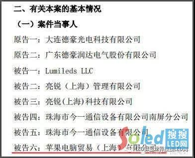 公告稱,公司發(fā)現(xiàn),美國蘋果公司在制造蘋果手機時使用了被告一推出的侵犯上述專利權的LED閃光燈芯片。11月26日,德豪潤達已收到廣東省高級人民法院送達的《受理案件通知書》。至此,蘋果公司的孫公司正式被中國土生土長的LED企業(yè)告上了法庭。