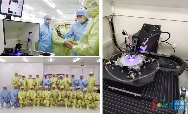 隨后,董事會(huì)一行參觀了外延MOCVD車間、質(zhì)檢間、芯片蒸鍍車間、清洗車間、黃光站、全測(cè)站,沿線有外延和芯片的工程師們演示芯片的生產(chǎn)過(guò)程。在外延車間,董事會(huì)一行聚集在一臺(tái)設(shè)備前,觀看外延片生長(zhǎng)情況,副總經(jīng)理邱圣杰做了詳細(xì)講解。在芯片點(diǎn)測(cè)間,董事會(huì)一行觀看芯片的點(diǎn)亮過(guò)程,一枚4寸的wafer晶圓在工程師的操作下被成功點(diǎn)亮,發(fā)出幽藍(lán)的光芒。據(jù)介紹,經(jīng)過(guò)近4個(gè)月的設(shè)備調(diào)試,江西基地的芯片性能已經(jīng)得到極大的提升,比如目前演示的4寸的wafer晶圓,其光電學(xué)性能達(dá)到了廈門公司同款產(chǎn)品的水準(zhǔn)。這標(biāo)志著江西基地自建設(shè)以來(lái),在生產(chǎn)研發(fā)上取得了階段性的進(jìn)展。