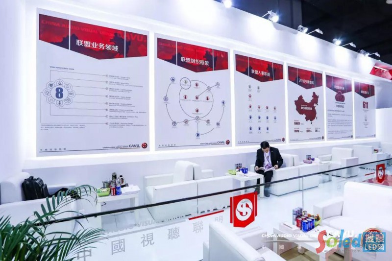 進(jìn)館之后第一視覺,即中國(guó)視聽聯(lián)盟展位。展位以白色基調(diào)為主,配以紅色的聯(lián)盟主視覺,代表著激情在視聽領(lǐng)域中的釋放。