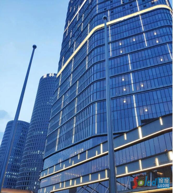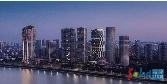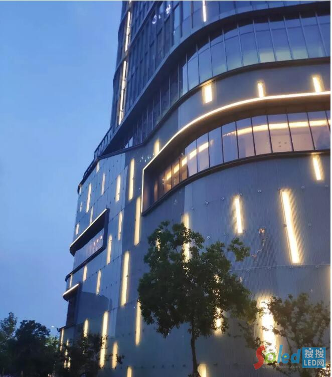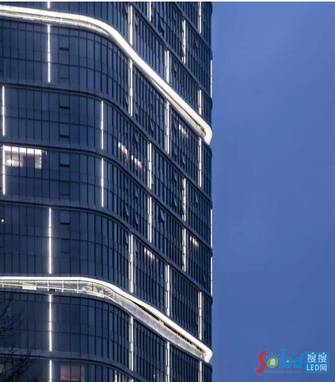 在避難層用洗墻燈照亮頂部,為建筑在夜景增加兩條靈動的燈光飄帶,創(chuàng)造建筑豐富的燈光層次感。