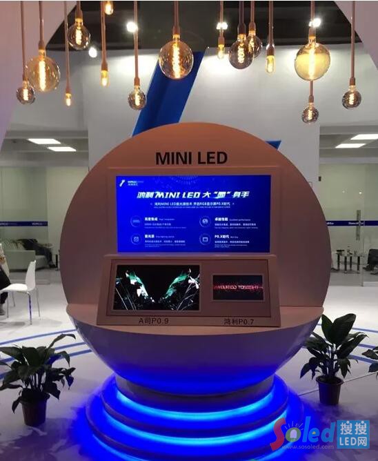 鴻利智匯展示了一個P0.7的Mini LED顯示屏,把芯片直接封裝在PCB板上,直接為面光源顯示,與旁邊的點光源顯示屏對比,效果非常明顯。據(jù)其研發(fā)技術(shù)人員介紹,Mini LED主要應(yīng)用于AR/VR/TV等顯示應(yīng)用,目前產(chǎn)品已送樣。