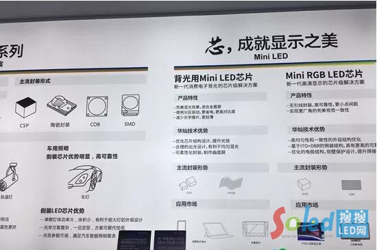 華燦光電展示了Mini LED背光芯片和Mini LED RGB芯片,均為倒裝芯片方案,背光芯片實現(xiàn)完美混光效果,RGB芯片實現(xiàn)無引線封裝,可靠性高,更利于超小間距顯示屏的應(yīng)用。