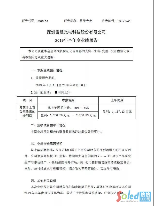 雷曼光電:上半年凈利預(yù)增50%-80%
