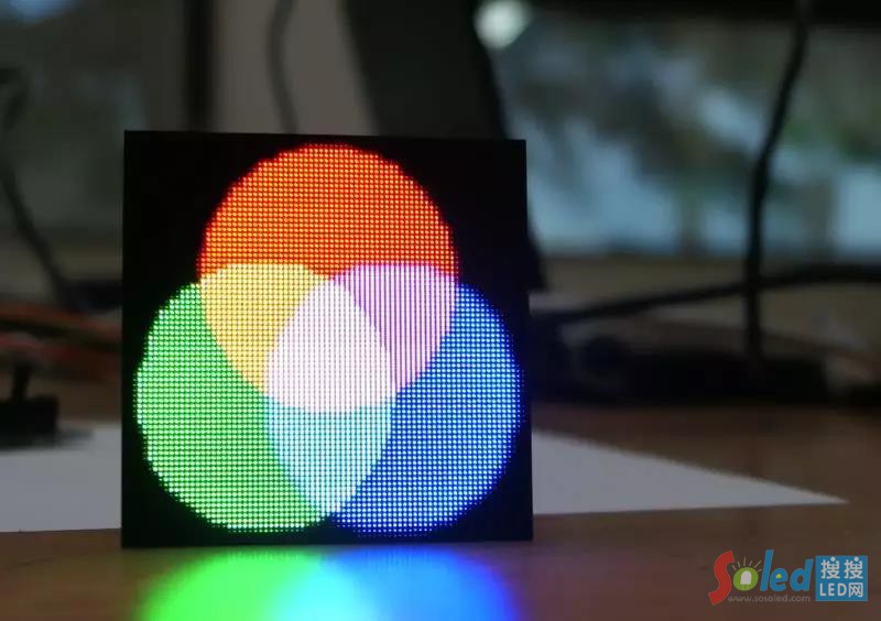 ▲ 2018 年所展出的超小間距 Micro LED 顯示模塊獨缺紅光,間距小于 800 μm、分辨率 80 x 80 pixel