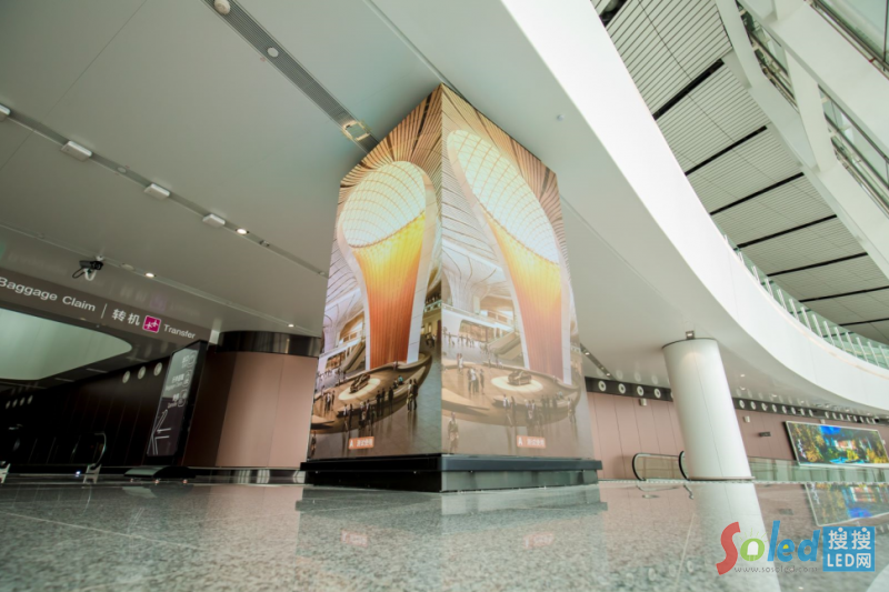 另二個四面環(huán)繞的LED包柱屏位于國際抵達(dá)區(qū)主干道,天然獨(dú)特視覺,強(qiáng)勢吸睛,90度直角無縫拼接工藝,播放內(nèi)容可360度無死角輻射來往人群,極具創(chuàng)意的形式為展示內(nèi)容賦予震撼力量。