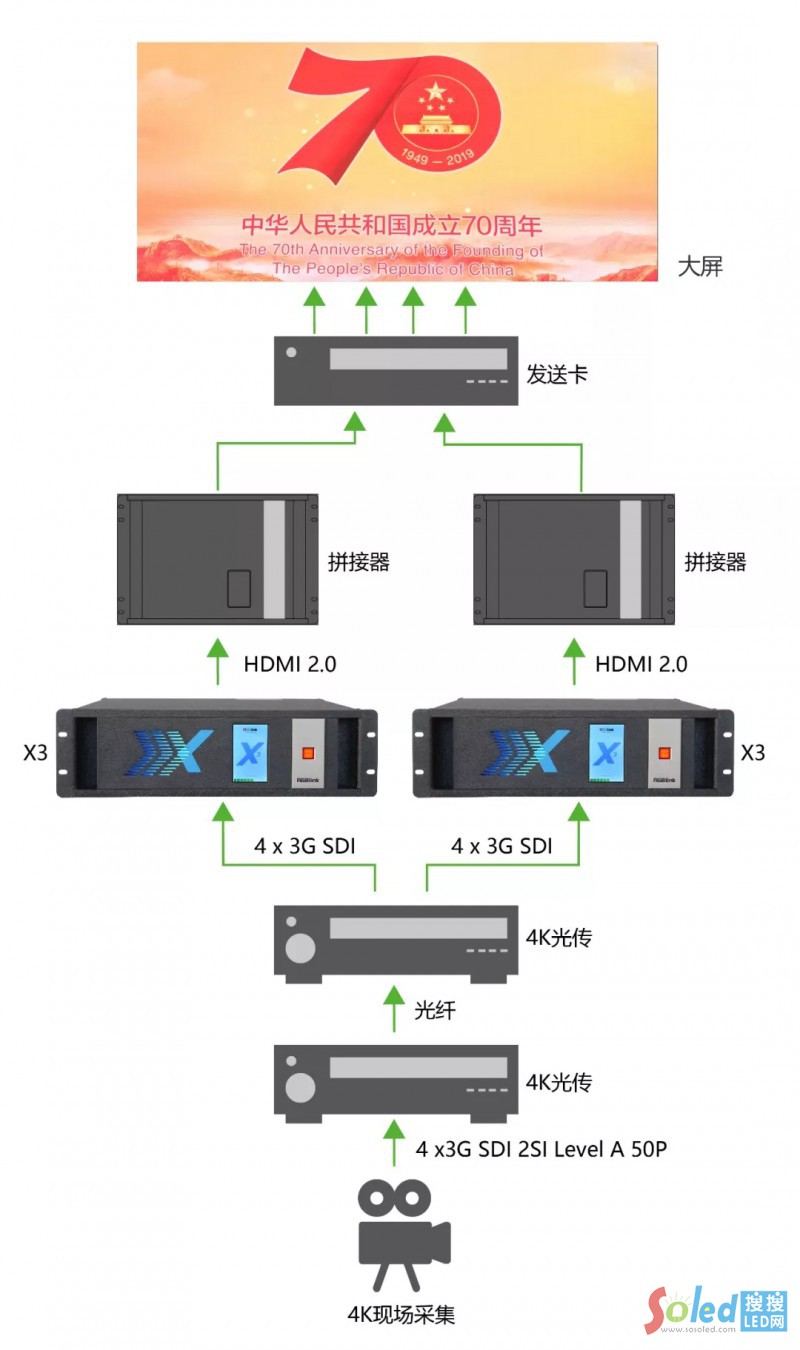 本次盛典是4K超高清直播,天安門正前方的4塊屏的分辨率為4992*2808,東西兩側(cè)的分辨率為3774*2080,,攝像機(jī)使用4K分辨率進(jìn)行拍攝,因此選擇了視誠(chéng)業(yè)內(nèi)領(lǐng)先的真4K級(jí)別解決方案——X3,選配12G SDI輸入模塊,HDMI2.0輸出模塊。