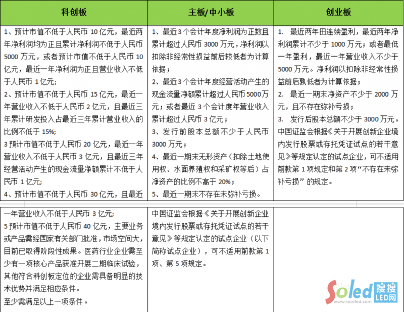當(dāng)前LED顯示屏企業(yè)對資金的渴求十分迫切,而上市是絕大多數(shù)企業(yè)夢寐以求的融資渠道。在現(xiàn)有幾大上市板塊中,新三板上市門檻最低,但由于融資效果不理想,一些上市后又不乏主動退市,所以LED顯示屏企業(yè)大多將創(chuàng)業(yè)板作為上市目標(biāo)。畢竟,相對于科創(chuàng)板、主板與中小板,創(chuàng)業(yè)板的上市門檻相對要低一些。