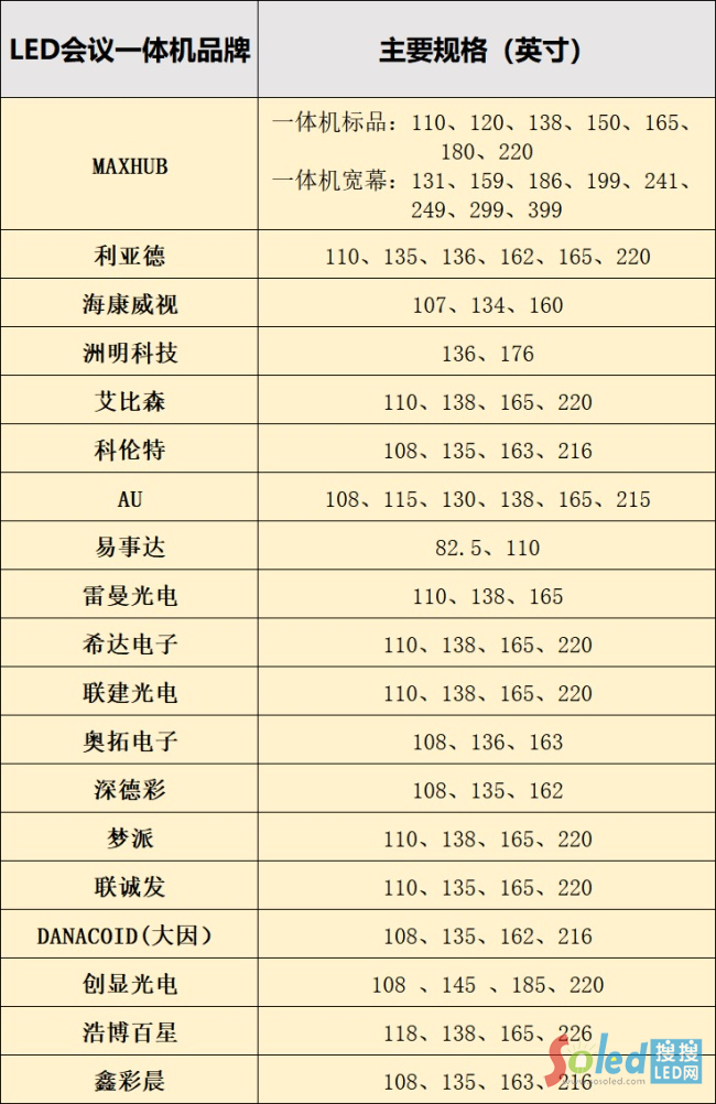 從目前眾多的LED企業(yè)在LED會議一體機(jī)上的布局看,尺寸范圍在110-220寸之間,可以看出多廠商在135/136/138寸(統(tǒng)稱為138寸)上均有布局;