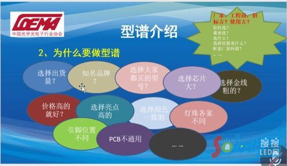 本次表貼系列型譜團體標準(意見稿)由行業(yè)協(xié)會牽頭負責,國星光電李宗濤博士對征求意見稿及編制過程進行了介紹與說明。本標準是半導體發(fā)光二極管系列產(chǎn)品的基礎標準之一,為其它相關(guān)標準和文件的制定提供產(chǎn)品類型選擇的依據(jù)。編制本標準的目的是:為相關(guān)的設計、生產(chǎn)和采購提供可以優(yōu)先選用的半導體發(fā)光二極管標準系列和品種;向招標公司優(yōu)先推薦的半導體發(fā)光二極管標準系列和品種;促進使用型譜所規(guī)定的半導體發(fā)光二極管標準系列和品種,最大限度的減少非標準類型產(chǎn)品的使用,提高標準化和系列化水平;對半導體發(fā)光二極管的生產(chǎn)、研制、開發(fā)進行控制和計劃管理,以較少的系列和品種滿足模塊和整機領域的使用需要,以有利于控制品種、增強投資效果、提高產(chǎn)品質(zhì)量和有效的配套供應。