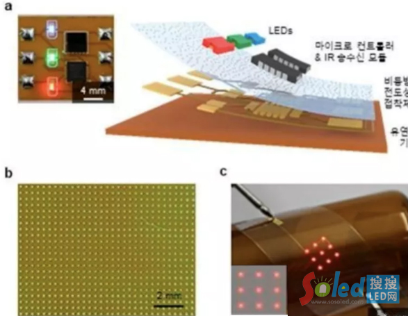 圖:a-柔性基板之上利用各向異性導(dǎo)電黏著劑形成RGB LED與電子芯片直接電路、b- 利用各向異性導(dǎo)電黏著劑的高密度大面積Micro LED排列、c- 柔性PET基板之上利用各向異性導(dǎo)電黏著劑的柔性Micro LED