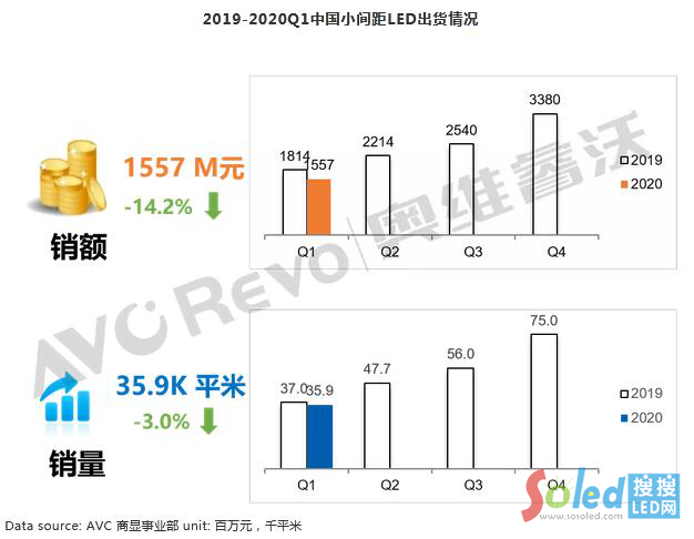 突如其來的新冠肺炎疫情給國(guó)內(nèi)經(jīng)濟(jì)帶來嚴(yán)重的影響,一季度國(guó)內(nèi)GDP同比下降6.8%,各行各業(yè)都受到了不同程度的損失。受疫情影響,2020年一季度小間距LED銷額15.6億元,同比下降14.2%,銷售面積35.9K平米,同比下降3%。
