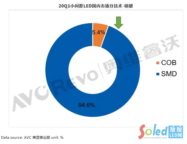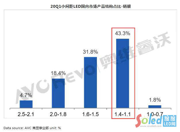 從封裝技術(shù)來看,主流封裝還是SMD技術(shù),一季度SMD封裝產(chǎn)品銷額占比94.6%,COB產(chǎn)品銷額市場(chǎng)占比5.4%,COB產(chǎn)品的客戶集中在政府部門的中高端用戶,一季度市場(chǎng)份額略有下滑,但隨著市場(chǎng)的恢復(fù),1.0以下市場(chǎng)需求增加,4月份COB訂單開始回暖。