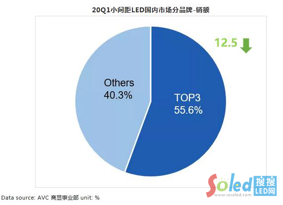 進(jìn)入小間距市場(chǎng)的品牌越來越多,大概分為三大陣營(yíng),第 一陣營(yíng)是傳統(tǒng)的LED顯示屏企業(yè),技術(shù)儲(chǔ)備成熟,研發(fā)能力強(qiáng),業(yè)務(wù)方向正在從傳統(tǒng)的專業(yè)顯示領(lǐng)域向商用領(lǐng)域、家用領(lǐng)域拓展,第二陣營(yíng)是傳統(tǒng)的DLP企業(yè),如威創(chuàng)以COB為突破口,第三陣營(yíng)是傳統(tǒng)的LCD企業(yè),其中安防類的海康、大華發(fā)展迅速,搶占大量市場(chǎng)份額。2020年一季度小間距LED TOP3品牌分別為利亞德、洲明、強(qiáng)力巨彩,市場(chǎng)份額占比55.6%,同比下降12.4個(gè)百分點(diǎn),安防企業(yè)緊隨其后,可以預(yù)見,2020年TOP品牌的競(jìng)爭(zhēng)格局將會(huì)發(fā)生巨大的變化。