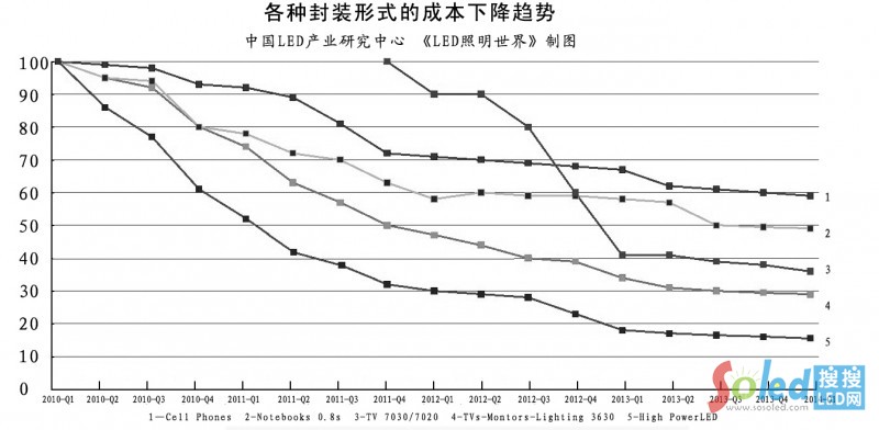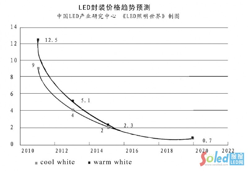 預(yù)測,照明市場將掀起LED封裝新一輪的發(fā)展浪潮。數(shù)據(jù)揭露了2012年的LED封裝市場照明部分稱為最大的應(yīng)用,超過了TV的背光源市場。LED背光源市場已經(jīng)飽和,這促使多數(shù)頂級供應(yīng)商們將他們的目光和資源投入照明行業(yè)。LED必定不斷的滲入照明市場,由于LED燈的零售價(jià)降低,顧客對LED總成本和節(jié)約潛能的理解度提高。LED燈具制造商們面臨的激烈競爭促使LED價(jià)格的下降。LED封裝價(jià)格在未來5年將低于當(dāng)前價(jià)格的一半以上。更低的價(jià)格將縮短顧客回收期。盡管主流應(yīng)用將增加,但供應(yīng)商們的利潤率最終會下降。LED燈具已滲透了照明應(yīng)用的多個(gè)領(lǐng)域,例如零售業(yè)和服務(wù)業(yè), LED封裝提供最大機(jī)會的是住宅部分。這部分的收入在2016年將增近3倍到27億。