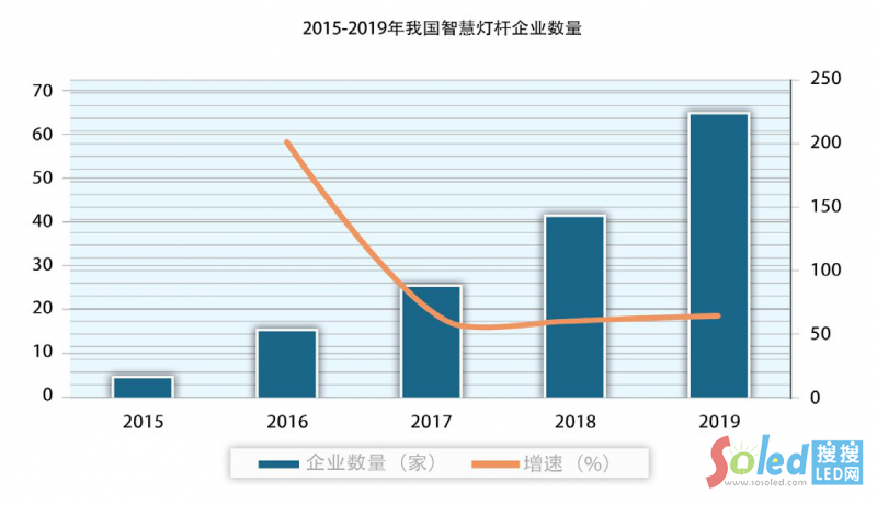 從目前落地的智慧燈桿示范性項(xiàng)目看,智慧燈桿外設(shè)種類繁多,而且都是模塊化安裝,廣泛應(yīng)用于交通、市政、園區(qū)、安防等場景,然而,當(dāng)前應(yīng)用普遍處于摸索階段。沖著它的巨大發(fā)展前景,瞄上智慧燈桿產(chǎn)業(yè)的各類企業(yè)多如牛毛,但真正有實(shí)際產(chǎn)品、能實(shí)落地實(shí)施的智慧燈桿企業(yè)其實(shí)并不多,中國照明行業(yè)協(xié)會的數(shù)據(jù)顯示,2015年只有5 家,截止去年(2019年)上升到65家。