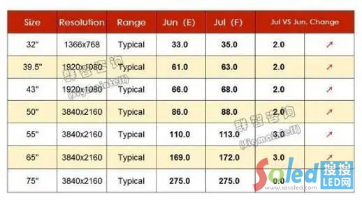 根據(jù)Witsview的最 新面板價(jià)格數(shù)據(jù)(6月下旬版),大尺寸TV面板的價(jià)格繼6月上旬企穩(wěn)后開啟上漲趨勢(shì),其中32寸均價(jià)上報(bào)1美金(漲幅3.1%),55寸均價(jià)上報(bào)2美金(漲幅1.9%),剩余尺寸如43寸和65寸報(bào)價(jià)與上旬持平,此外桌顯面板和筆記本面板價(jià)格也呈現(xiàn)整體上漲趨勢(shì)。