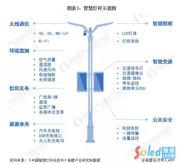 智慧燈桿是智慧城市建設(shè)的重要組成部分,是將攝像頭、廣告屏、充電樁、小基站等功能集于一身的新型信息基礎(chǔ)設(shè)施,能夠完成對(duì)照明、公安、市政、氣象、環(huán)保、通信等多個(gè)行業(yè)的數(shù)據(jù)信息進(jìn)行采集、發(fā)布以及傳輸。與此同時(shí),作為5G時(shí)代車聯(lián)網(wǎng)建設(shè)、云網(wǎng)建設(shè)以及通信網(wǎng)絡(luò)建設(shè)的重要組成部分,智慧燈桿也將得以廣泛應(yīng)用。