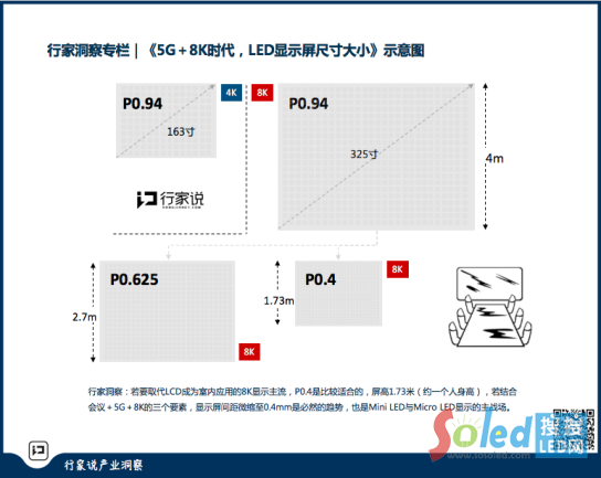 除此之外,LED顯示產(chǎn)品若要取代LCD、投影成為室內(nèi)應(yīng)用的8K顯示主流,P0.4(點(diǎn)間距)是比較適合的(屏高1.73米,約一個(gè)人身高);若結(jié)合“會(huì)議+5G+8K”的三個(gè)要素,LED顯示屏間距微縮至0.4mm將是必然的趨勢,而這正是Micro LED顯示的主戰(zhàn)場。