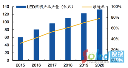 根據(jù)2017年國(guó)家發(fā)改委等十三個(gè)部委聯(lián)合發(fā)布的《半導(dǎo)體照明產(chǎn)業(yè)“十三五”發(fā)展規(guī)劃》要求,到2020年LED照明產(chǎn)值由2015年1,551億元達(dá)到5,400億元,LED照明滲透率達(dá)到70%。根據(jù)前瞻產(chǎn)業(yè)研究院統(tǒng)計(jì),2020年中國(guó)LED照明產(chǎn)品產(chǎn)量有望達(dá)到132億只,滲透率達(dá)到78%。