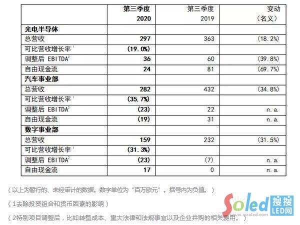 歐司朗日前發(fā)布第三財季財報。公司第三財季營業(yè)收入為6.06億歐元,在一年內(nèi)可比基礎(chǔ)上下降29.4%,但與行業(yè)主要銷售市場相比,表現(xiàn)好于預(yù)期?鄢厥忭椖壳,稅息折舊及攤銷前利潤(EBITDA)為負(fù)2,700萬歐元,遠(yuǎn)高于預(yù)期。其中,汽車業(yè)務(wù)(AM)受疫情沖擊最嚴(yán)重,而光電半導(dǎo)體業(yè)務(wù)(OS)則有著良好表現(xiàn),與預(yù)期相符。由于資金流動性的有效管理,全公司的自由現(xiàn)金流控制在負(fù)700萬歐元。