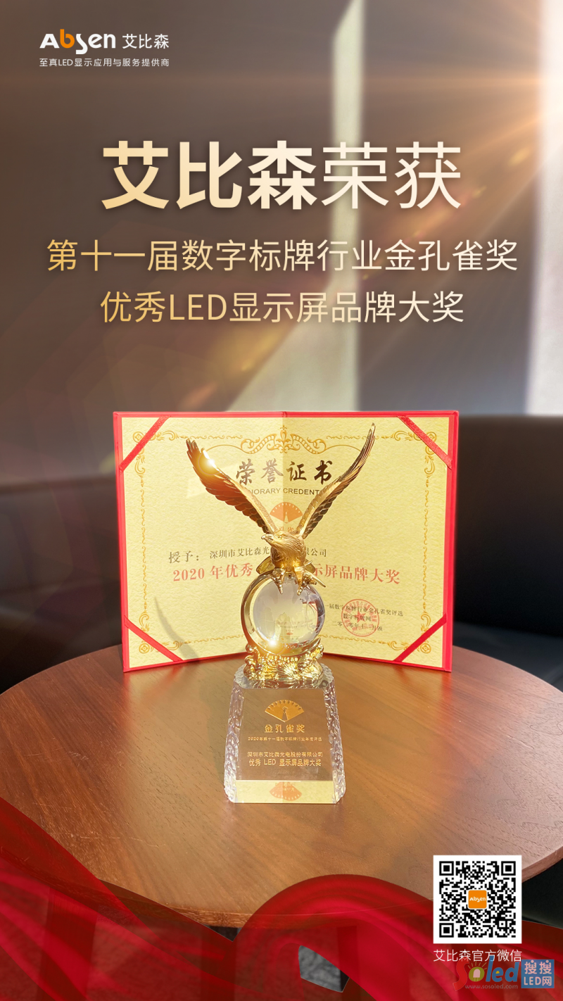 近日,艾比森捷報(bào)頻傳,再次斬獲五項(xiàng)行業(yè)頗具分量的大獎(jiǎng)。分別是中國(guó)光學(xué)光電子行業(yè)協(xié)會(huì)“2019-2020年度國(guó)內(nèi)LED知名品牌大獎(jiǎng)”和“2019-2020年度中國(guó)LED應(yīng)用工程優(yōu)秀獎(jiǎng)”、第七屆LED首創(chuàng)獎(jiǎng)“品牌創(chuàng)新15強(qiáng)”、2020華顯獎(jiǎng)“年度LED小間距知名品牌獎(jiǎng)”以及第十一屆數(shù)字標(biāo)牌行業(yè)金孔雀獎(jiǎng)“優(yōu)秀LED顯示屏品牌大獎(jiǎng)”。