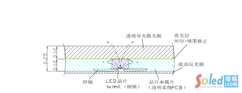 主要部件:1)透明導光散光板(PC材料),2)晶片承載片(透明FPC,PET材料);晶片承載片(透明FPC)陣列開有晶片嵌口,LED晶片鑲嵌在晶片嵌口中(chip in board),采用FC晶片(4*6mil);透明FPC上整面絲印熒光層(粘貼熒光膜),下整面是底部反光膜;晶片側面四周的縫隙有透明封膠。