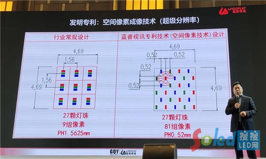 值得一提的是,該產(chǎn)品使用了藍(lán)普視訊的發(fā)明專利——空間像素成像技術(shù)。藍(lán)普視訊介紹,這是行業(yè)首次且獨(dú)家提出基于空間像素成像設(shè)計的全倒裝COB,此次發(fā)布會是首次公開并向行業(yè)開放該技術(shù)。與行業(yè)的常規(guī)設(shè)計不同,在藍(lán)普視訊的空間像素技術(shù)下,27顆燈珠可實(shí)現(xiàn)81組像素,達(dá)到超級分辨率,顯著提升顯示效果,十分具有創(chuàng)新性和前瞻性。
