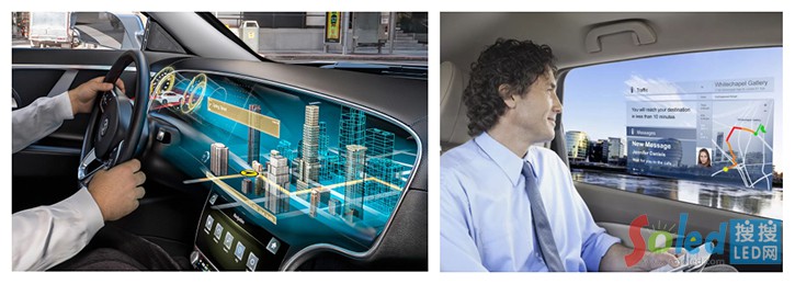 LCD輝度不夠,而OLED有信賴性包袱(對水汽及氧氣敏感),Micro LED高輝度、可異形、無尺寸限制、可制成透明屏等特點,非常適合汽車這類半戶外場景。隨著智能駕駛汽車逐步發(fā)展,可以在車前玻璃、車窗、后視鏡上采用Micro LED技術(shù),用來顯示駕駛員狀況、路況等監(jiān)測數(shù)據(jù)。