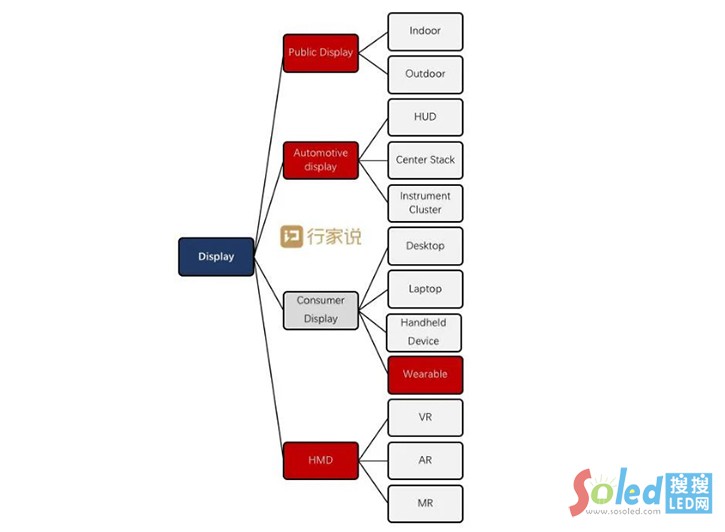 首先,我們從觀賞型態(tài)的角度看,分成四大類顯示——公共顯示、車用顯示、消費電子顯示、頭戴顯示。