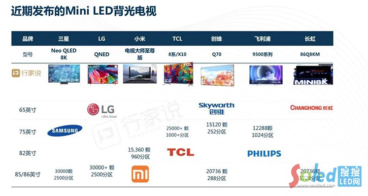 而從Mini LED背光應用領域看,去年開始,Mini LED資本熱度大增,全年新品密集發(fā)布,以芯片消耗拉動最大的電視場景為例,三星、LG、小米、TCL、創(chuàng)維、飛利浦、長虹、夏普八大電視品牌廠為例,均陸續(xù)高調推出了號稱Mini LED版電視。