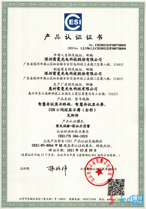 近日,雷曼光電COB小間距全彩顯示屏、雷曼智慧會議顯示終端、智慧會議顯示屏經(jīng)全面測試與評估,符合CESI 8K超高清認(rèn)證要求,獲得CESI 8K產(chǎn)品認(rèn)證證書。這是行業(yè)內(nèi)8K Micro LED超高清顯示屏首獲權(quán)威8K認(rèn)證,雷曼光電成為國內(nèi)首家獲得該認(rèn)證的LED超高清顯示屏企業(yè)。