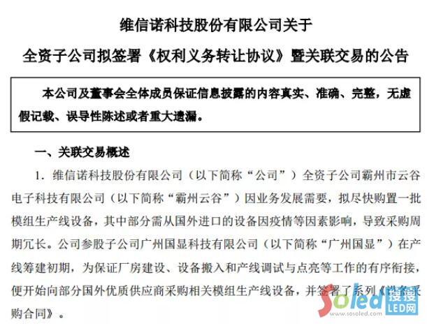 3月31日維信諾發(fā)布公告,維信諾科技股份有限公司(以下簡(jiǎn)稱“公司”)全資子公司霸州市云谷電子科技有限公司(以下簡(jiǎn)稱“霸州云谷”)因業(yè)務(wù)發(fā)展需要,擬盡快購(gòu)置一批模組生產(chǎn)線設(shè)備,其中部分需從國(guó)外進(jìn)口的設(shè)備因疫情等因素影響,導(dǎo)致采購(gòu)周期冗長(zhǎng)。公司參股子公司廣州國(guó)顯科技有限公司(以下簡(jiǎn)稱“廣州國(guó)顯”)在產(chǎn)線籌建初期,為保證廠房建設(shè)、設(shè)備搬入和產(chǎn)線調(diào)試與點(diǎn)亮等工作的有序銜接,便開(kāi)始向部分國(guó)外優(yōu)質(zhì)供應(yīng)商采購(gòu)相關(guān)模組生產(chǎn)線設(shè)備,并簽署了系列《設(shè)備采購(gòu)合同》。