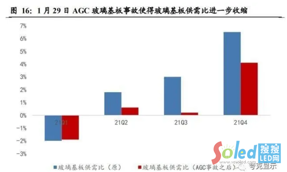 從節(jié)奏上看,2021年二季度京東方B17持續(xù)爬坡,惠科長(zhǎng)沙線于2月實(shí)現(xiàn)量產(chǎn)后也在持續(xù)爬坡,供應(yīng)端是存在一定邊際增量的,但由于1月底AGC玻璃基板供應(yīng)中 斷事件影響,友達(dá)、群創(chuàng)、惠科 3 月起來(lái)自旭硝子玻璃基板供應(yīng)受到影響(友達(dá)、群創(chuàng)6代玻璃基板供應(yīng)量將減少 30%,而惠科位在重慶和滁州 8.6 代廠,其玻璃基板也將減少30%的供貨量),新增的供給并非供需平衡下的壓力,更多地僅僅是供 給緊張狀態(tài)的緩解,實(shí)際的新增壓力在 AGC 玻璃基板供應(yīng)恢復(fù)后可能會(huì)得到顯現(xiàn)。