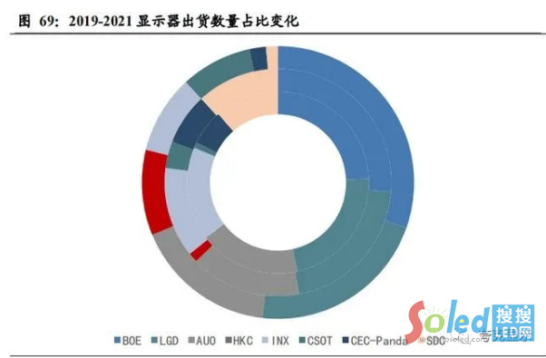 隨著國(guó)內(nèi)面板行業(yè)的崛起,京東方、TCL華星得到了長(zhǎng)期、持續(xù)的發(fā)展,市場(chǎng)份額節(jié)節(jié)攀升。根據(jù)第三方調(diào)研機(jī)構(gòu)統(tǒng)計(jì)數(shù)據(jù)顯示,2020 年京東方與 TCL 華星位于TV出貨面積前兩位,出貨面積占比分別達(dá)到了24%和 15%,未來(lái)隨著兩大龍頭內(nèi)生外延產(chǎn)能的進(jìn)一步擴(kuò)張(除了各自本身還有10.5代線在爬坡外,京東方對(duì)中電熊貓兩條8.5代線產(chǎn)線的收購(gòu)、TCL華星對(duì)于蘇州三星產(chǎn)線的收購(gòu)),兩大龍頭2022年TV出貨面積市占率也有望達(dá)到 26%和 20%。