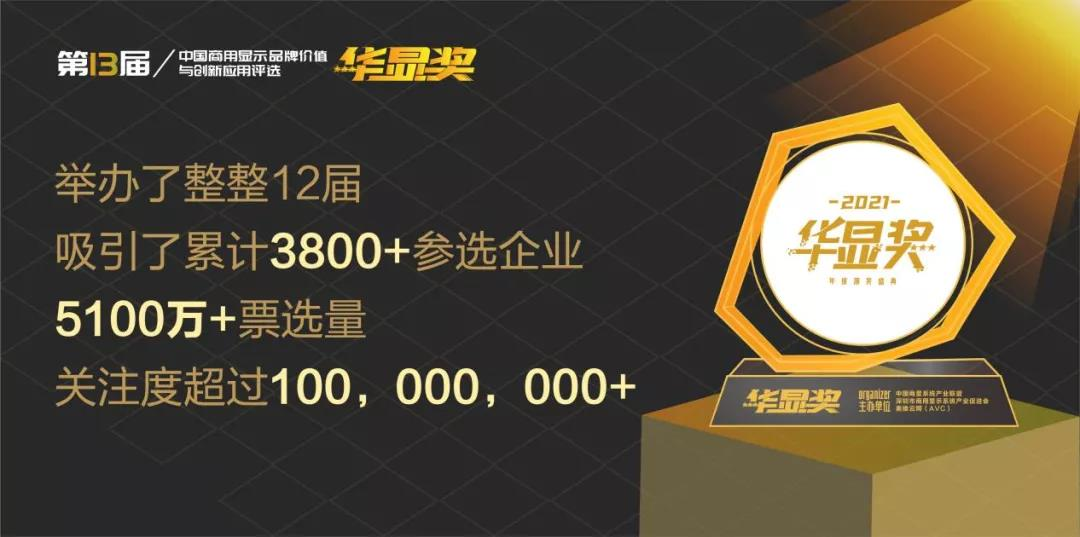 前言:2021【第13屆·華顯獎】評選活動,由中國商用顯示系統(tǒng)產業(yè)聯(lián)盟、深圳市商用顯示系統(tǒng)產業(yè)促進會、奧維云網、《商顯世界》雜志社聯(lián)合舉辦,通過報名征集、網絡投票、專家委評審等環(huán)節(jié)進行公平、公正、公開擇優(yōu)評選。華顯獎作為商顯行業(yè)標桿的的榮譽獎項,自舉辦評選以來吸引了行業(yè)上下游產業(yè)鏈諸多企業(yè)參與,目的是為了打造商顯行業(yè)各領域創(chuàng)新優(yōu)秀企業(yè)模范標桿,提升、維護行業(yè)知名企業(yè)品牌形象,挖掘行業(yè)潛在黑馬,表彰先進典范,推動企業(yè)銳意創(chuàng)新、積極進取,助力企業(yè)長虹發(fā)展。