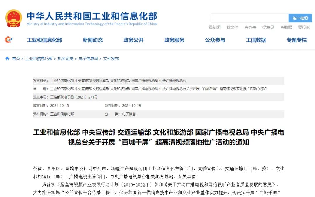 以“點(diǎn)亮百城千屏 炫彩超清視界”為主題,支持有條件的城市設(shè)立超高清公共大屏,通過(guò)展播社會(huì)主義核心價(jià)值觀、黨的建設(shè)、北京冬奧會(huì)、文化旅游等優(yōu)質(zhì)超高清4K/8K內(nèi)容,提升超高清視頻產(chǎn)業(yè)的滲透性。中央電視臺(tái)新聞直播間節(jié)目在黃金時(shí)間對(duì)該活動(dòng)通知做專題報(bào)道,引發(fā)行業(yè)震動(dòng)。