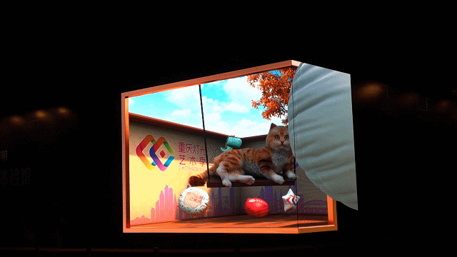 畫面一轉(zhuǎn),此時(shí)裸眼3D大屏正上演著“萌寵駕到”:三兩只貓貓狗狗姿態(tài)各異,趣意盎然。