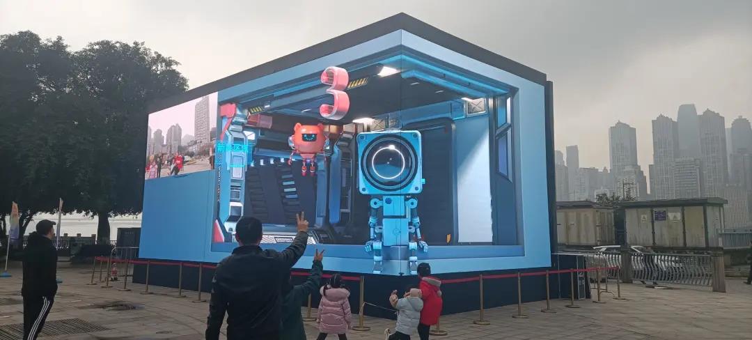 ▲裸眼3D內(nèi)容:機(jī)器人“大洲與小明”互動(dòng)拍照
