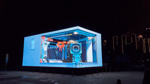夜幕時(shí)分,山城版賽博朋克都市再現(xiàn):列車在空中穿梭城市,小魚(yú)仿佛突破時(shí)空門來(lái)到眼前,城市里還有“臉譜”巡視......融入重慶本地文化的裸眼3D內(nèi)容,別具一格。