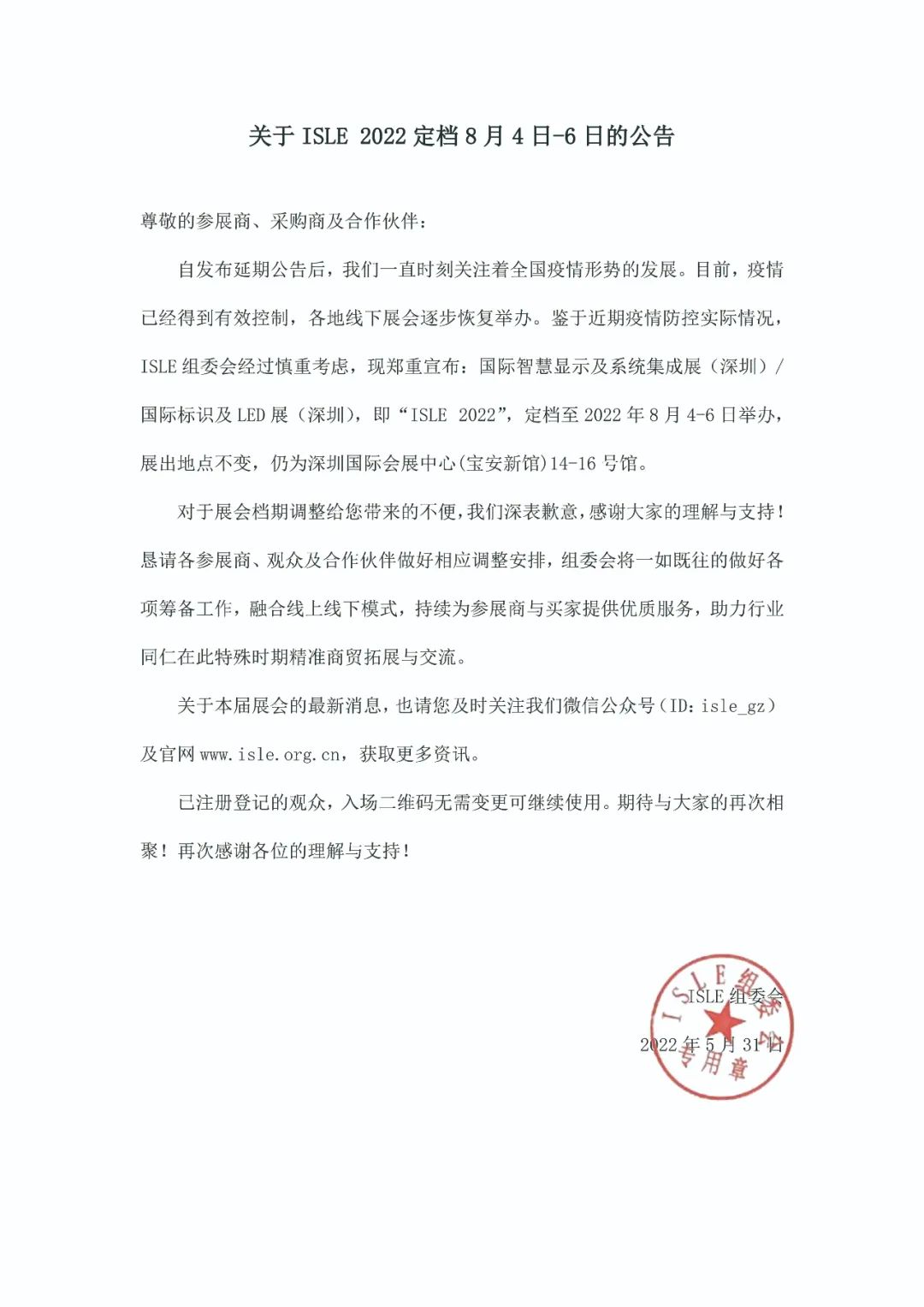 自發(fā)布延期公告后,我們一直時(shí)刻關(guān)注著全國(guó)疫情形勢(shì)的發(fā)展。目前,疫情已經(jīng)得到有效控制,各地線(xiàn)下展會(huì)逐步恢復(fù)舉辦。鑒于近期疫情防控實(shí)際情況,ISLE組委會(huì)經(jīng)過(guò)慎重考慮,現(xiàn)鄭重宣布:國(guó)際智慧顯示及系統(tǒng)集成展(深圳)/國(guó)際標(biāo)識(shí)及LED展(深圳),即“ISLE 2022”,定檔至2022年8月4-6日舉辦,展出地點(diǎn)為深圳國(guó)際會(huì)展中心(寶安新館)6-8號(hào)館。